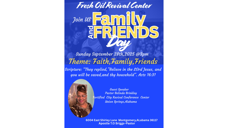 Fresh Oil Revival Center warmly invites you to join us for Family and Friends Day on Sunday, September 28th at 3:00 PM.