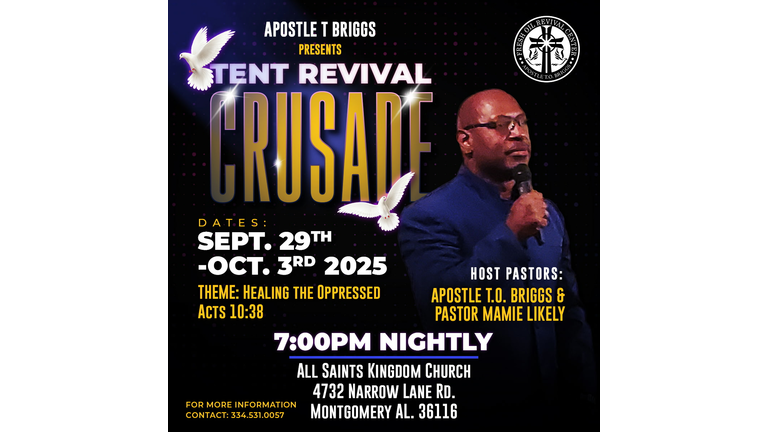 Join Fresh Oil Revival Center for their Tent Revival Crusade, September 29th–October 3rd at 7pm nightly at All Saints Kingdom Church!