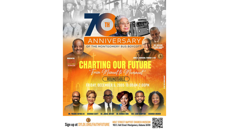 The 70th Anniversary of the Montgomery Bus Boycott presents a roundtable discussion Chartering Our Future "From Moment to Movement. This event will be held on Friday, December 5th from 10am-2pm at Holt St. Missionary Baptist Church. Sign up to attend at SYLDI.ORG/FAITHFUTURE